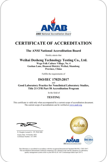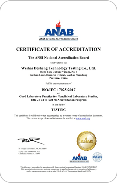 We hold certifications including ANAB GLP, OECD GLP, and CNAS GLP, enabling us to meet registration requirements for FDA, CE, NMPA, and other regulatory bodies.